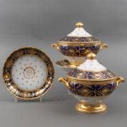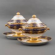 Paar ovale porseleinen terrines op onderschotels met 'beau bleu' en verguld decor, vermoedelijk uitvoering Porcelain de Paris, Frankrijk, eerste kwart 19e eeuw, 32 × 38,5 × 26,5 cm, herkomst: koning Louis Philippe (volgens overlevering), graaf van Bylandt, en privécollectie van kunsthandelaar Abraham van der Meer (1927-2008), destijds gevestigd op de Spiegelgracht 3 te Amsterdam