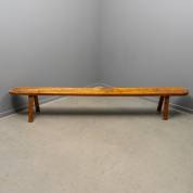 Lange beuken bank met schuine pootjes en afgeronde einden, Frankrijk 19e eeuw, breedte 277 cm