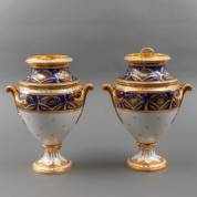 Paar porseleinen vaasvormige ijshouders, of 'Seau à glace', met 'beau bleu' en verguld decor, vermoedelijk uitvoering Porcelain de Paris, Frankrijk, eerste kwart 19e eeuw -één met defecte greep (deels nog aanwezig) en barsten in buik-, hoogte 36 cm, herkomst: koning Louis Philippe (volgens overlevering), graaf van Bylandt, en privécollectie van kunsthandelaar Abraham van der Meer (1927-2008), destijds gevestigd op de Spiegelgracht 3 te Amsterdam
