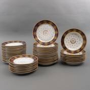 43 porseleinen borden, Ø 23 cm, waaronder zeven diepe borden, met 'beau bleu' en verguld decor, vermoedelijk uitvoering Porcelain de Paris, Frankrijk, eerste kwart 19e eeuw -slijtage aan verguldsel, 16 platte borden met defecten-, herkomst: koning Louis Philippe (volgens overlevering), graaf van Bylandt, en privécollectie van kunsthandelaar Abraham van der Meer (1927-2008), destijds gevestigd op de Spiegelgracht 3 te Amsterdam