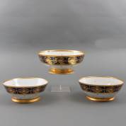 Porseleinen kom en een paar kleinere kommen met 'beau bleu' en verguld decor, vermoedelijk uitvoering Porcelain de Paris, Frankrijk, eerste kwart 19e eeuw -bodembarsten-, grootste kom 10,5 × 25 cm, herkomst: koning Louis Philippe (volgens overlevering), graaf van Bylandt, en privécollectie van kunsthandelaar Abraham van der Meer (1927-2008), destijds gevestigd op de Spiegelgracht 3 te Amsterdam