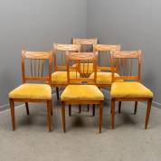 Zes iepen stoelen met ruitvormig snijwerk en getorste spijlen in de rug, de zittingen bekleed met gele stof, directoire, 90 × 49 × 53 cm