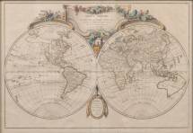 Deels ingekleurde gravure: wereldkaart, 'Mappe-monde ou description du globe terrestre', door graveur Jean Lattré en cartograaf Jean Janvier, gedateerd 1762, 30 × 45 cm