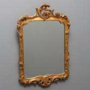 Spiegel in rijk bewerkte goudgeschilderde houten lijst, Louis Quinze -kleine defecten aan lijst en hoekje spiegelglas afgebroken, spiegelglas niet origineel-, 78 × 51 cm