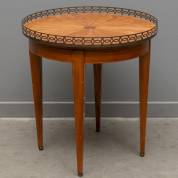 Satijnhoutgefineerde bijzettafel met messing galerijrand, staand op taps toelopende poten, Louis Seize-stijl, circa 1900 -kleine defecten-, 53 × Ø 50 cm