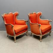 Paar fauteuils met steenrode bekleding en grijsgelakt houten frame, rococostijl, 19e/20e eeuw, 85 × 72 × 76 cm