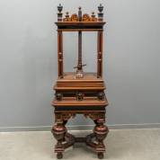 Notenhouten linnenpers met ebbenhouten accenten, regelverbinding tussen de bolpoten, gesneden leeuwenmascarons en vier persplanken, Hollands, tweede helft 17e eeuw -enkele kleine stukjes snijwerk en profiel ontbreken, enkele onvakkundige verlijmingen, enkele loszittende stukjes fineer-, 179 × 69 × 65 cm