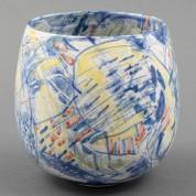 Gert de Rijk (1945-2009), keramische vaas met aan de binnen- en buitenzijde een polychroom decor, op onderzijde gemonogrammeerd en gedateerd '96 herkomst: Collectie Galerie Jas, Utrecht, 15,5 × Ø 16 cm