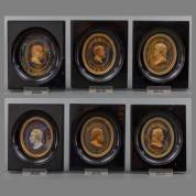 Zes gemarmerde en vergulde gegoten stenen of glazen portretcameeën, tweede helft 19e eeuw, uniform ingelijst -één omlijsting ontbreekt, een ander vastgelijmd-, 7 × 5,5 cm