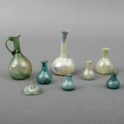 Zeven groen/blauwe glazen flesjes en een losse braamnop -enkele defecten-, inclusief aankoopfactuur van een 'lichtgroen glazen flesje, Anatolia 4e-5e eeuw', aangekocht bij Jacques Schulman, Amsterdam, 1975, hoogste 9 cm