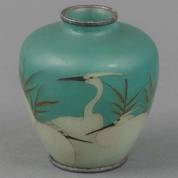 Japans plique-à-jour vaasje met kraanvogel decor en zilveren monturen, 19e/20e eeuw, 6,5 × 5 cm