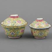 Twee Chinese geelgeëmailleerde dekselkommen met vol bloemdecor, verschillend in formaat, 18e/19e eeuw, 10 × Ø 12 cm
