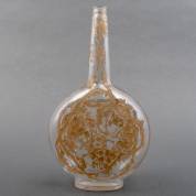 Glazen karaf, model Aubépines, met gebruind reliëfdecor van meidoornbloesem, uitvoering René Lalique, meegeperst merk 'R. Lalique', circa 1914 -stop ontbreekt, aanslag in bodem-, herkomst: Lalique Gallery, Doesburg, 2021, hoogte 28 cm