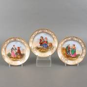 Drie porseleinen borden met uitgespaard bloemdecor en familiewapen in de vergulde rand, het plat met polychrome decors: paar figuren in Italiaanse klederdracht, Napels, 19e eeuw -lichte slijtage aan decor door stapelen-, Ø 23,5 cm