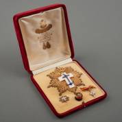 Onderscheiding: Spaans grootkruis voor verdienste ter zee met wit versiersel -kleine beschadiging aan het blauwe email-, in cassette samen met drie miniatuurmedailles, Ø 9,5 cm