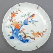 Japans porseleinen bord met gecontourneerde rand en Kakiemon-decor van een vogel op bloesemtak, Fuku zegelmerk, 18e eeuw, Ø 22 cm