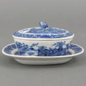 Chinees porseleinen botervloot op onderschotel, het geheel met blauw-wit decor van vaas in tuin, Qianlong, afmetingen inclusief onderschotel 8 × 15 × 12 cm