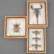 Drie vitrinekastjes met geprepareerde dieren: schorpioen, grote kever en drie juweelkevers, 19 × 14 cm