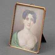 Portretminiatuur in gouden lijstje: jonge vrouw met groene omslagdoek, mogelijk Frankrijk, eerste helft 19e eeuw -achterkant is los-, 9 × 7 cm