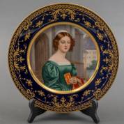 Porseleinen bord met polychroom beschilderd decor van Anna Hilmayer, één van de 36 Beierse schoonheden die zijn geschilderd voor de 'Galerie van Schoonheden' van koning Lodewijk I van Beieren, naar origineel van Joseph Karl Stieler, uitvoering Hutschenreuther, 20e eeuw, Ø 25 cm