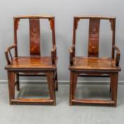 Twee Chinese iepen stoelen met gesneden medaillons in de rugleuning -resten van rode lak-, zithoogte 51 cm, breedte 61 cm