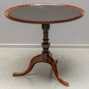 Ronde mahonie tafel met opstaande gecontourneerd blad, staand op driespantpoot, Engeland, 18e eeuw, met glazen blad, Ø 85 cm