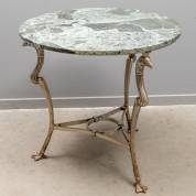 Ronde gueridon-tafel met groen natuurstenen blad, op metalen onderstel met vogelvormen, 73 × Ø 76 cm