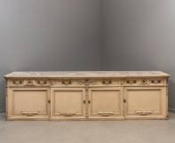 Crèmewitgelakt buffetmeubel met natuurstenen blad en esdoorn interieur, staande op plint, Louis Seize-stijl, eind 19e/begin 20e eeuw -gebruikssporen en slijtages-, 82 × 308 × 76 cm