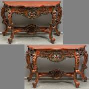 Paar roodgebeitste houten wandtafels, het deels opengewerkte snijwerk met rozen, staand op licht gebogen poten verbonden door kruisregel, vermoedelijk Indonesië -gebruikssporen-, 80 × 121 × 41 cm