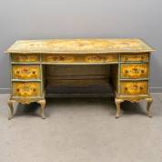 Polychroom beschilderd damesbureau met floraal decor, Frankrijk, eind 19e eeuw -gebruikssporen, plekjes verfverlies, houtworm, poot gelijmd-, 74 × 155 × 65 cm