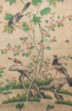 Chinese School: vogels bij rozenstruik, uitsnede van een behang, aquarel en gouache op papier, 18e eeuw, vergelijkbaar behang is te vinden in landhuis Oud-Amelisweerd -kreukels en enkele defecten-, 85 × 57 cm