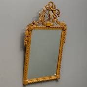 Spiegel in vergulde houten lijst met rondlopende banderol, bekroond door zeevaartattributen en eikenkrans, Louis Seize -één attribuut defect, ornament aan onderzijde ontbreekt-, 87 × 54 cm