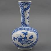 Chinees porseleinen trompetvaas met blauw-wit decor van figuren in tuin, gemerkt, Kangxi -randchipjes in hals, glazuurschilfers van voetrand-, 15,5 cm
