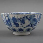 Chinees porseleinen kom met blauw-wit decor: spelende zotjes en lange lijzen, Kangxi, gemerkt -gelijmd, enkele scherven missen-, 11 × Ø 21 cm