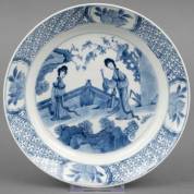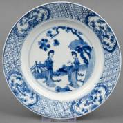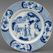 Chinees porseleinen dubbelbord met blauw-wit decor: figuren in landschap, de rand met servetwerk en vier cartouches met figuren, Kangxi gemerkt en periode -randchip van achterzijde-, Ø 27 cm