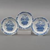 Drie Chinees porseleinen bordjes met blauw-wit bloemenvaasdecor, Chenghua gemerkt, Kangxi -alle met randchipjes, twee met haarlijn-, Ø 16 cm