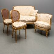 Verguld houten canapé en corbeille, fauteuil en twee stoelen, waarvan de rugleuningen met rietbespanning, alle met goudkleurige bekleding, Louis Seize-stijl, eind19e eeuw