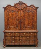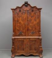 Wortelnotengefineerd kabinet met orgelgebogen onderkast, de deuren en kap belijmd met accoladevormige profilering, Hollands, Louis Quatorze -klein profieltje ontbreekt bovenop kap, ladegeleider ontbreekt achter deuren, lichte fineerschade op zijkant linksonder, conditie van het front van de kast desalniettemin zeer goed-, 240 × 190 × 65 cm