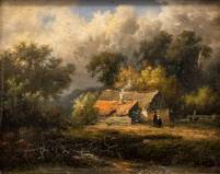 Hollandse School: bosrijk landschap met figuren bij een woning, niet gesigneerd, 19e eeuw -enige craquelé-, 17 × 21 cm