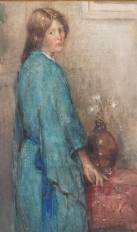 Aquarel: meisje in blauwe japon, r.o. onduidelijk gesigneerd, 27 × 16,5 cm