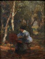 Schilderij: schilderes werkend en plein air in een bosrijke omgeving, olieverf op paneel, r.o. onduidelijk gesigneerd, 18 × 14 cm
