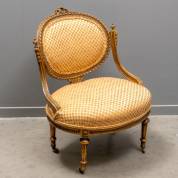 Damesfauteuil met rijk gestoken goudkleurige rug en onderstel, het rug- en zitkussen bekleed met geblokte stof, Louis Seize-stijl, 19e eeuw -lakwerk sleets-, 78 × 62,5 × 62 cm