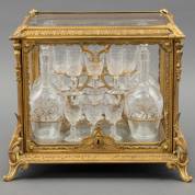 Glazen 'cave à liqueur' met verguld montuur, inclusief vier karaffen -één stop met chipje- en veertien glaasjes, 19e/begin 20e eeuw -sleutel en twee glaasjes missend-, 30 × 35 × 29 cm