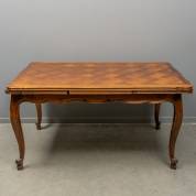 Geparquetteerde kersenhouten tafel met uitschuifbaar gecontourneerd blad, Frankrijk, 20e eeuw -lichte gebruikssporen-, ingeschoven formaat 78 × 150 × 100 cm