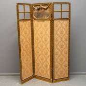 Drieslags verguld houten kamerscherm, de bovenkant met geslepen ruitjes, de onderkant bekleed met stof, Louis Seize-stijl, eind 19e eeuw -defecten-, hoogte 166 cm