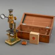 Messing microscoop in mahonie kistje, adres: J.A.J. Schokking, Spui 18, Amsterdam, daarbij twee doosjes met glaasjes, eind 19e eeuw -gebruikssporen, oxidatie-, 9 × 27 × 13 cm
