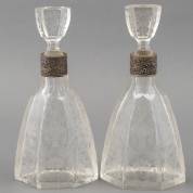 Paar geslepen kristallen karaffen met florale decors en zilveren monturen, biedermeier -één gechipt-, hoogte inclusief stop circa 30 cm