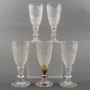 Set van vijf glazen met gegraveerd decor: fazanten, krokodil, tapir, wolven en vogels, eind 19e eeuw -één glas vakkundig gerepareerd met zilveren montuur-, 13 × Ø 5,5 cm