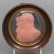 Reliëfdubbelportret in was: koning Willem I en koningin Wilhelmina van Pruisen, in houten en messing lijstje met bol glas, circa 1815-1820, lijstje Ø 18 cm