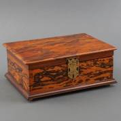 Koloniaal hardhouten kistje met 'slaap' of 'pelet' patronen en palissander randen, voorzien van verguld metalen en gegraveerd beslag, het interieur met lichtbruin fluweel bekleed, staande op vier messing pootjes, 18e/19e eeuw -krimpscheur in deksel-, 12 × 29 × 21 cm